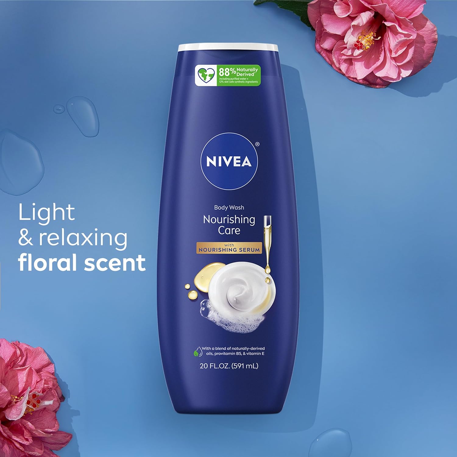 Give your skin the care it deserves with NIVEA Nourishing Care Body Wash. Frequent showers and hot water can strip your skin of essential oils, which can lead to moisture loss. NIVEA Nourishing Care Body Wash for dry skin provides nourishing moisture for healthy-looking skin that feels soft and smooth. This lightly scented body wash with nourishing serum is enriched with a unique blend of plant-derived oils, essential skin lipids and vitamins that work together to care for your skin while gently cleansing. Enjoy a pleasant floral aroma in your shower with this delightfully scented body wash. The creamy lather leaves skin amazingly soft and pampered, and can also be used as an alternative to shaving cream. This body wash is ideal for everyday use, and is free of Parabens and Microplastic Particles. A nourishing body wash is a key part of a skincare routine, and pairs well with NIVEA Body Lotion as part of a daily skin care regimen. To use, apply NIVEA Nourishing Body Wash onto cleansing pouf, massage the creamy lather onto your body, and rinse off for a refreshed skin feel. NIVEA is a trusted leader in the field of skin care products, with more than 130 years of expertise.